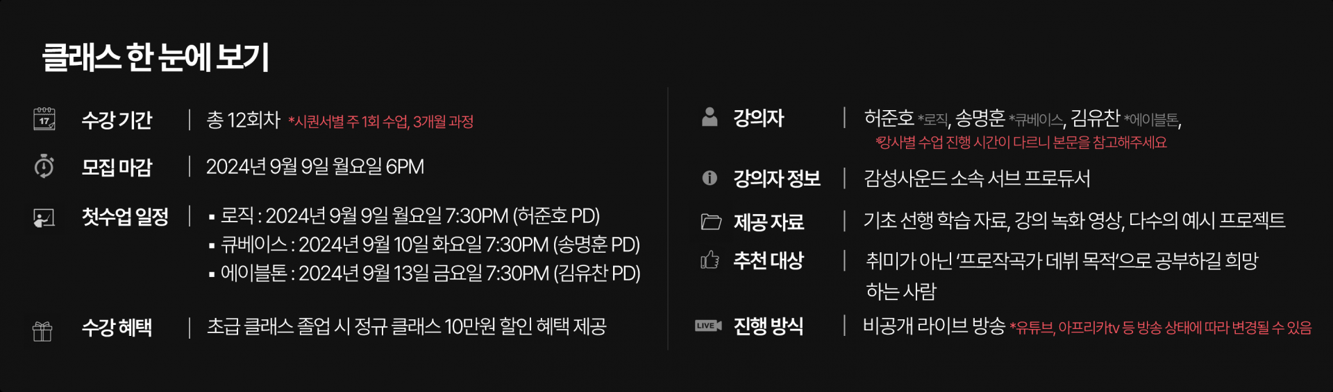| 2주차 | DAW(큐베이스, 로직, 에이블톤) 기능 설명 • 사전 제공 자료 설명 • 실전에 사용하는 주요 기능을 직업 예시를 들어가며 하나의 클래스에 모두 담아낸다! |