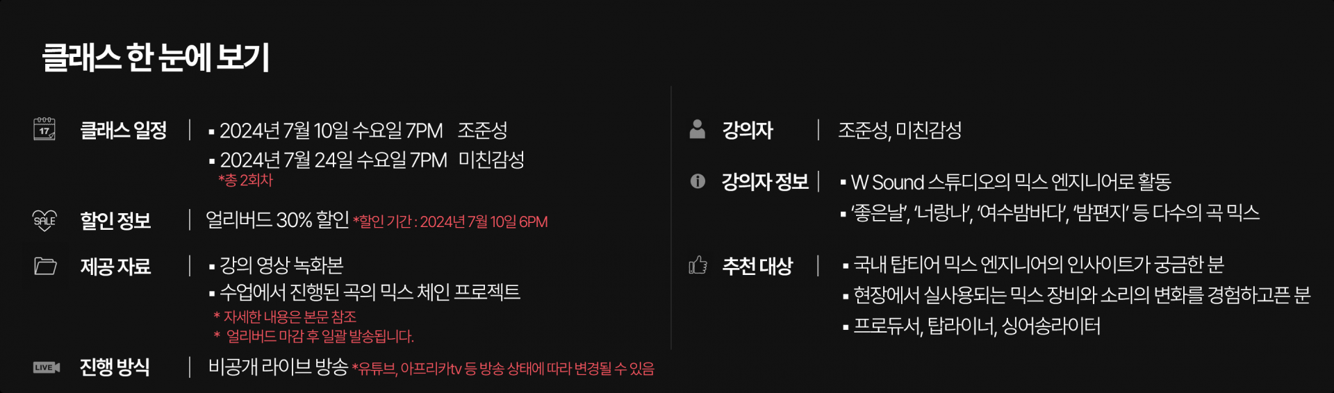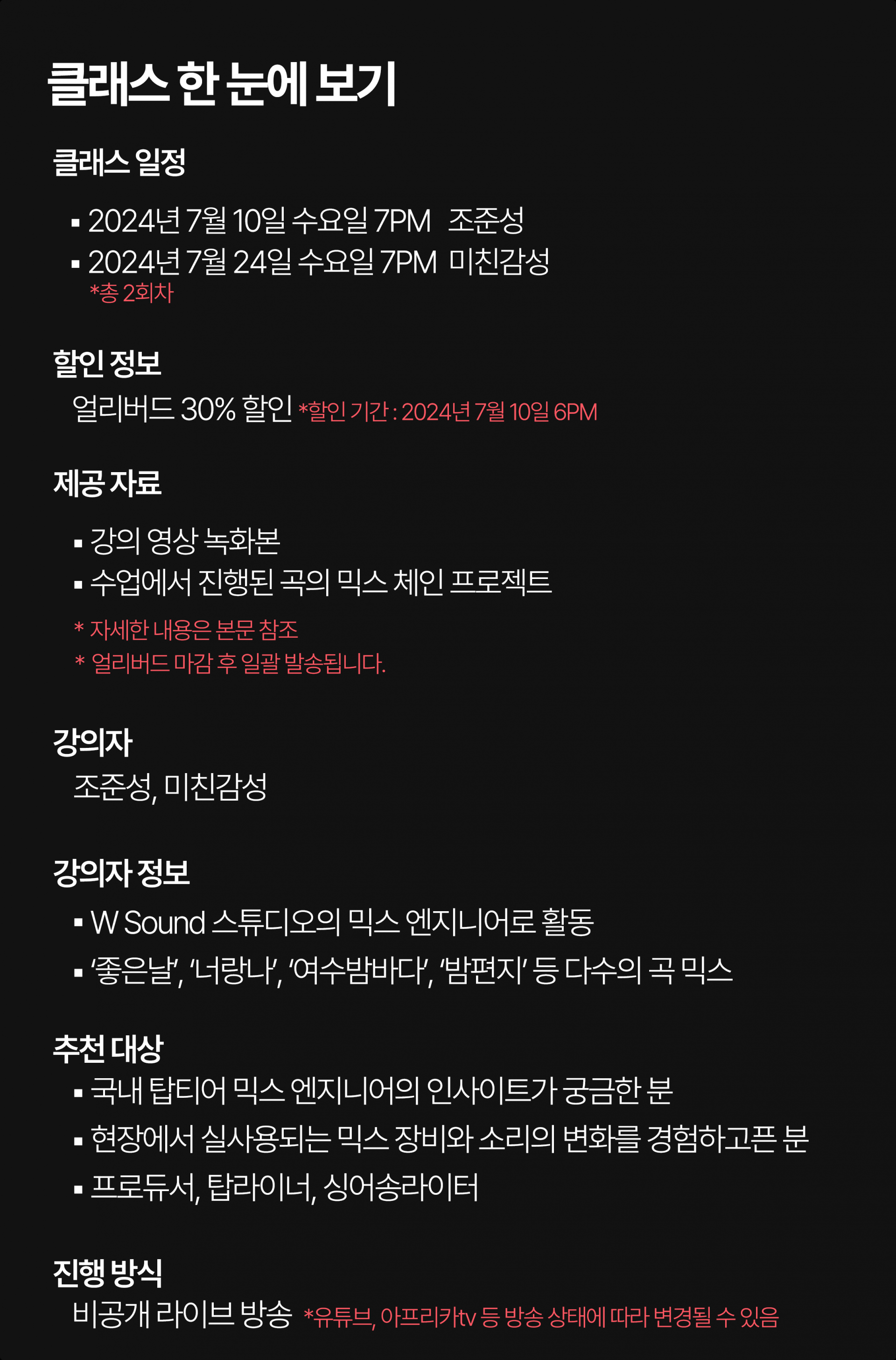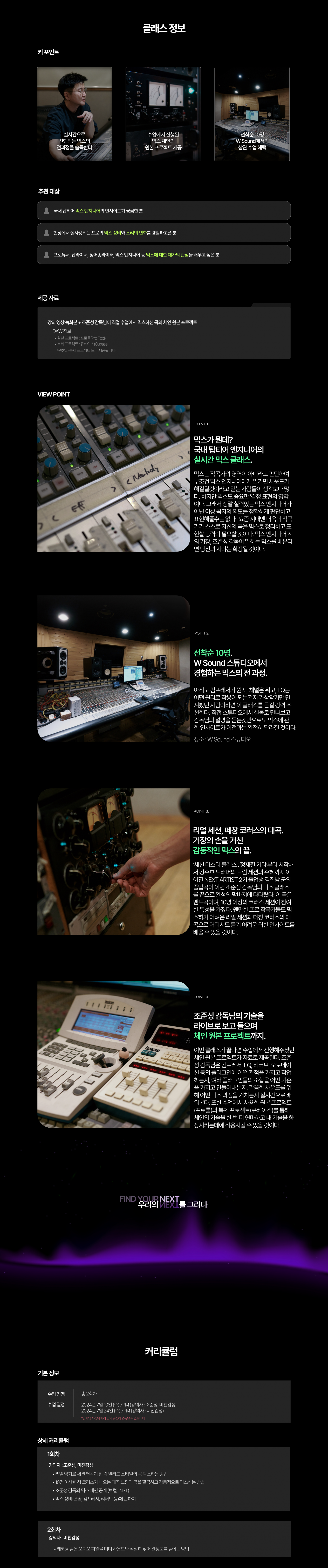 아이유의 ‘좋은날’, ‘너랑 나’, ‘밤편지’, ‘팔레트’ 등 부터 시작해서 성시경의 ‘너의 모든 순간’, 버스커 버스커의 ‘여수밤바다’까지… 수많은 히트곡의 믹스를 도맡았던 ‘조준성’ 감독은 W Sound 스튜디오의 믹스 엔지니어로 활동하고 있다. 어렸을적부터 피아노를 배웠고 전공자의 길을 걷지는 못했지만 장비에 관심이 많았던 ‘조준성’ 감독은 음악을 계속 할수 있는 군악대에 들어가게 되었고 제대 후 우연히 레코딩 학과 광고를 보게 되어 평소 장비에 관심이 많았기에 뒤도 안돌아보고 레코딩 아카데미에 등록하여 콘솔을 보는 순간 ‘바로 이거야’라며 믹스 엔지니어 공부를 미친듯이 시작하게 되었다고 한다. 그렇게 꾸준히 걸어온 ‘믹스’의 영역을 누군가에게 맡기기만 하는 영역이 아닌, 스스로 하는 즐거운 영역이 되었으면 하는 마음이 수강생에게 전달되었으면 하는 바람으로 이 클래스를 진행하려고 한다.